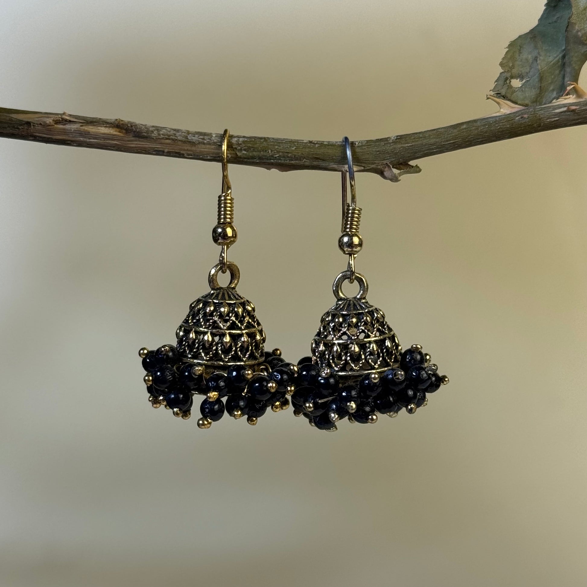 Understated gold jhumkay that whisper elegance with black beaded details.